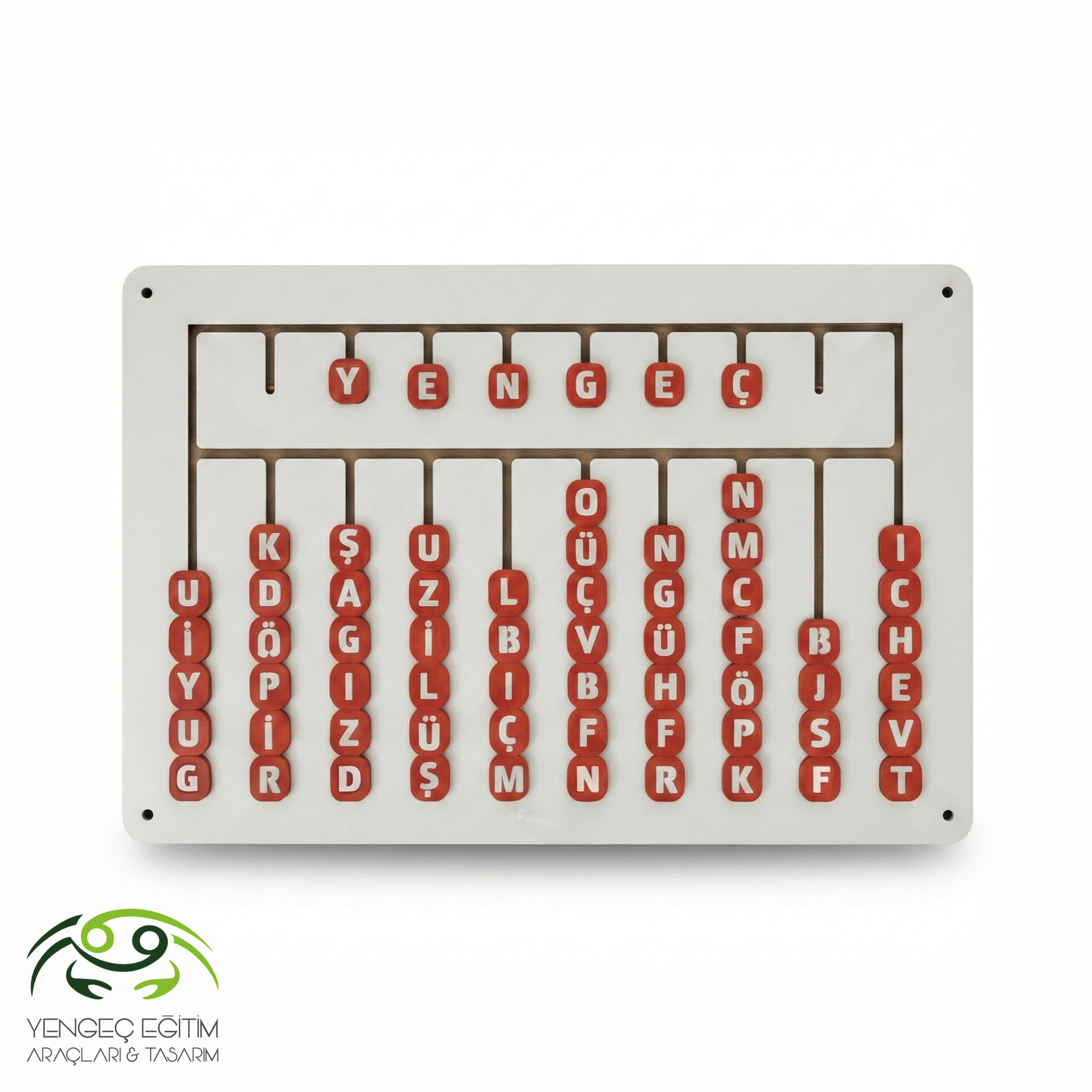 Ahşap Duvara Monte Harf ve Kelime Öğrenme Panosu, okul öncesi ve ilkokul başlangıcı dönemindeki çocuklara Türk alfabesini oyun yoluyla öğretir. 65×40 cm ölçülerindeki MDF laminat panel, dikey raylar üzerinde dizili kırmızı harf butonları taşır. Her butonun üzerinde Türk alfabesinin bir harfi yer alır. Üst panelde ise kelime oluşturma alanı mevcuttur. Böylece çocuklar harfleri yukarı aşağı kaydırarak hem tek tek harf tanıma hem de kelime türetme çalışması yapar.