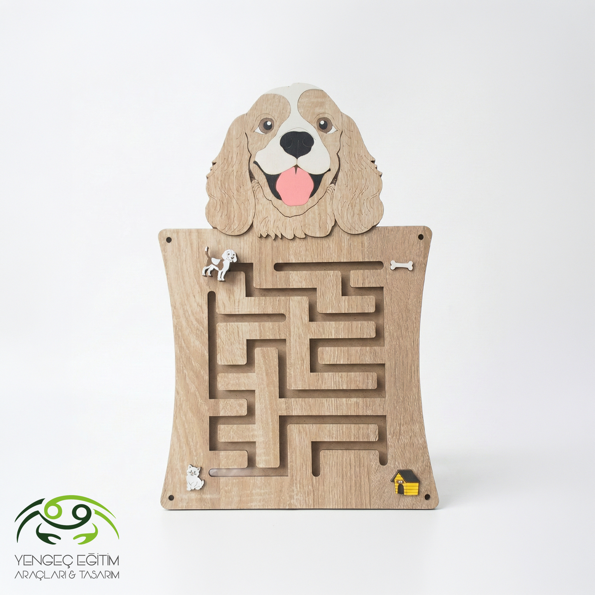 Köpek Labirent Duvar Aktivite Oyunu, okul öncesi dönemdeki çocuklara problem çözmeyi oyun yoluyla öğretir. 36×55 cm ölçülerinde ve 2 cm kalınlığında MDF lam panel, kahverengi gövdesi ve sevimli köpek figürüyle çocukların dikkatini anında çeker. Panel yüzeyinde oyulmuş kanal labirenti yer alır. Çocuklar küçük köpek figürünü bu kanallar içinde parmaklarıyla kaydırır. Labirent üzerinde kemik, kedi ve köpek kulübesi olmak üzere üç farklı hedef noktası bulunur. Böylece çocuk her seferinde farklı bir rotayı keşfederek hedefe ulaşmaya çalışır.